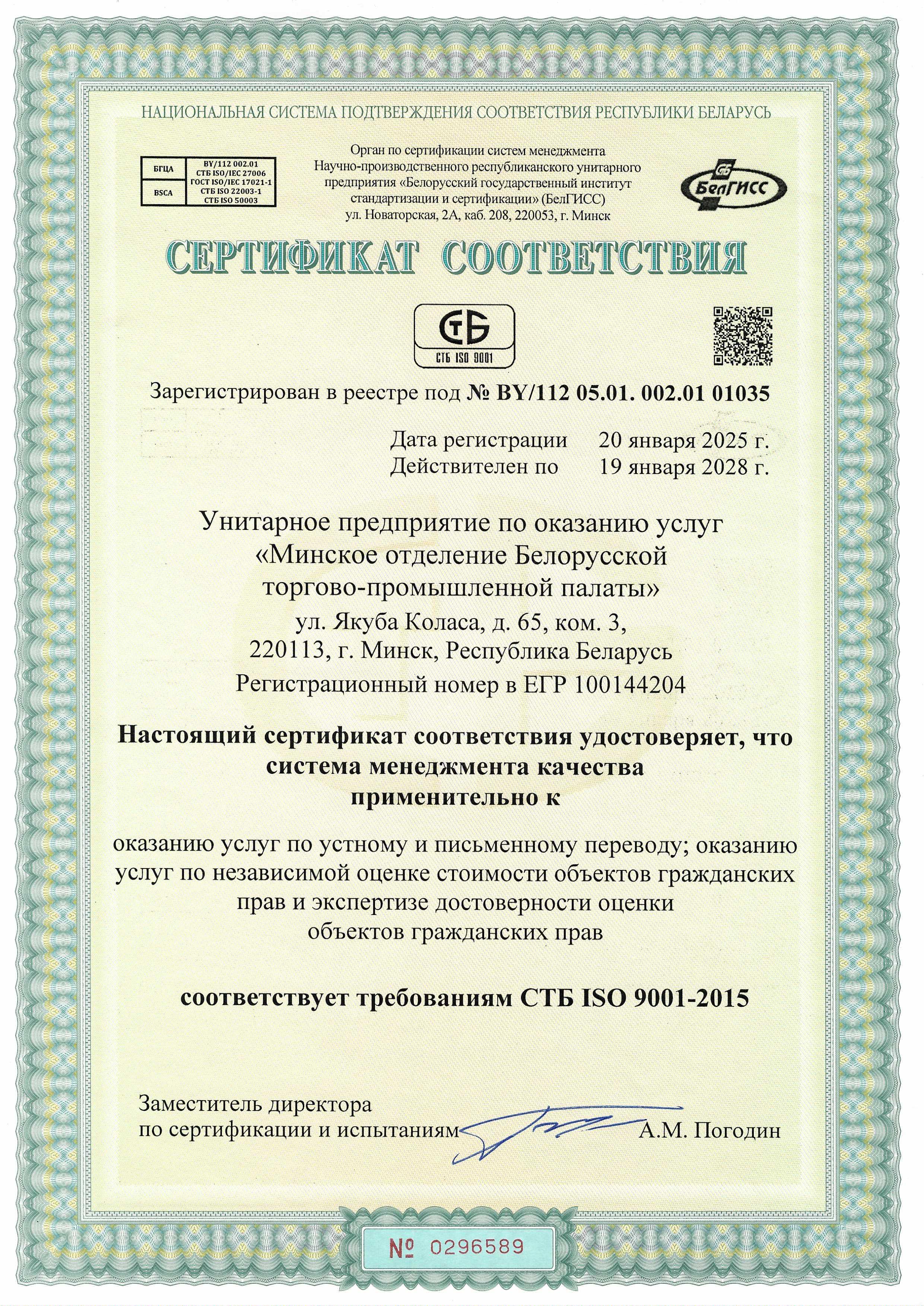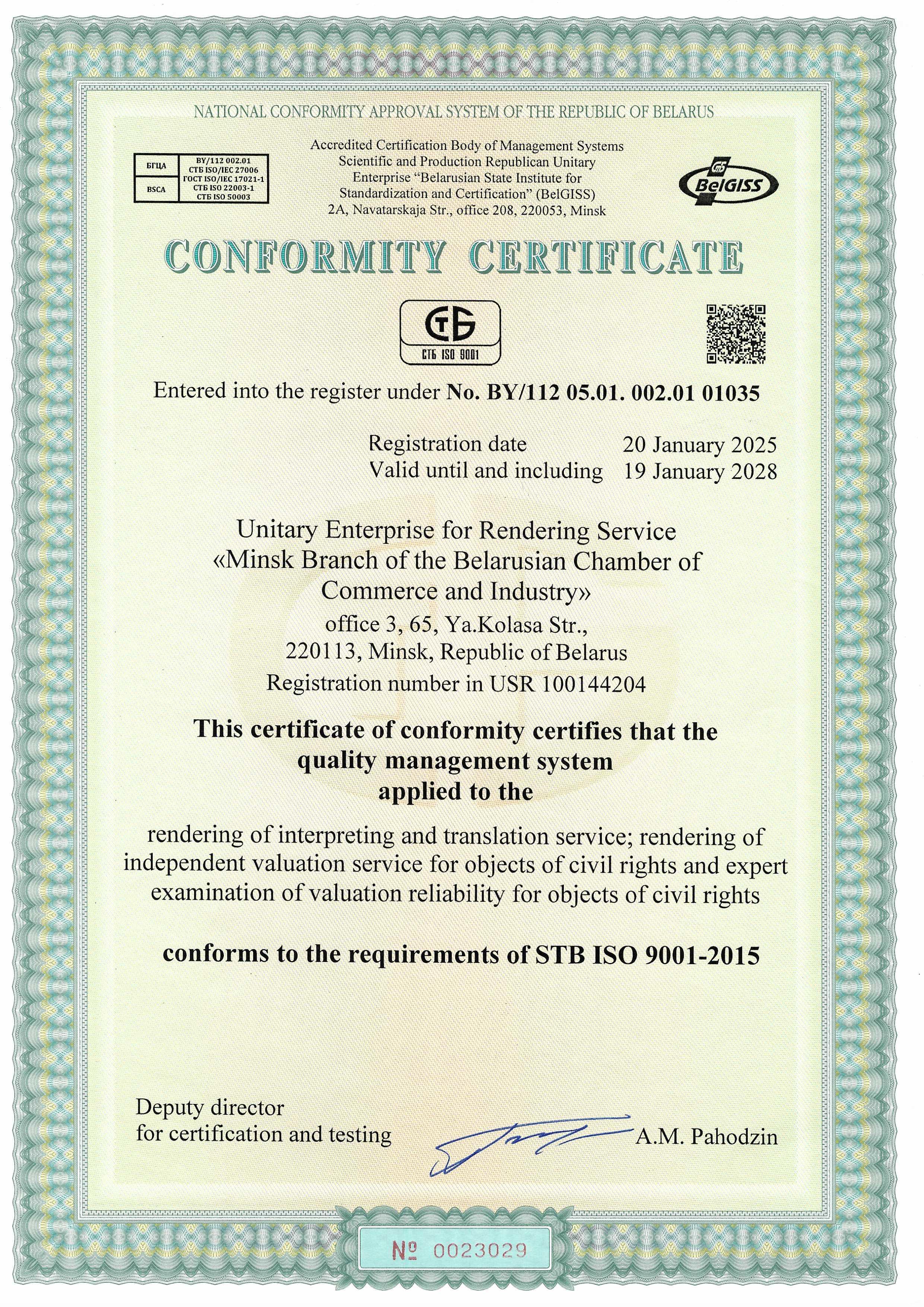 30 декабря 2022 года Унитарное предприятие "Минское отделение БелТПП" получило новый сертификат соответствия, удостоверяющий, что система менеджмента качества применительно к оказанию услуг по устному и письменному переводу, независимой оценке стоимости и экспертизе достоверности объектов гражданских прав соответствует требованиям СТБ ISO 9001-2015.